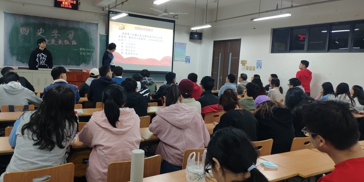 能科1801和能科1802班于10月21日下午举行了“四史学习,重走长征路”的主题班会,由能科1802班的耿达同学主持,会上详细介绍了长征的前因后果,包括党史、新中国史、改革开放史、社会主义发展史四史的概述,让大家重新认识,理解,领悟。会议中,同学们认真听讲,并且还在之后进行的知识问答环节中积极参与,踊跃发言,同时正确率也很高,给大家留下了深刻的印象,相信这场班会一定能取得不错的思想引领效果。习近平总书记指出:“只有坚持思想建党、理论强党,不忘初心才能更加自觉,担当使命才能更加坚定”“要把学习贯彻党的创新理论作为思想武装的重中之重,并同学习党史、新中国史、改革开放史、社会主义发展史结合起来。”遵从党的领导,响应党的号召,在同学们的心中播种革命之花,成长为社会主义建设者的参天大树。