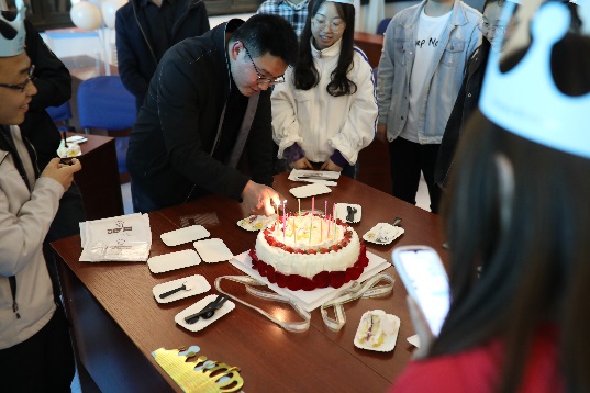 然后,进入了最重要的过生日环节,同学们都戴上生日帽,唱起生日歌,点蜡烛许愿,将聚会的气氛烘托到了顶点。吹灭蜡烛后,同学们开始品尝美味的生日蛋糕,享受自己生日喜悦的同时,也感受这份来自学院和导员的甜与关怀。