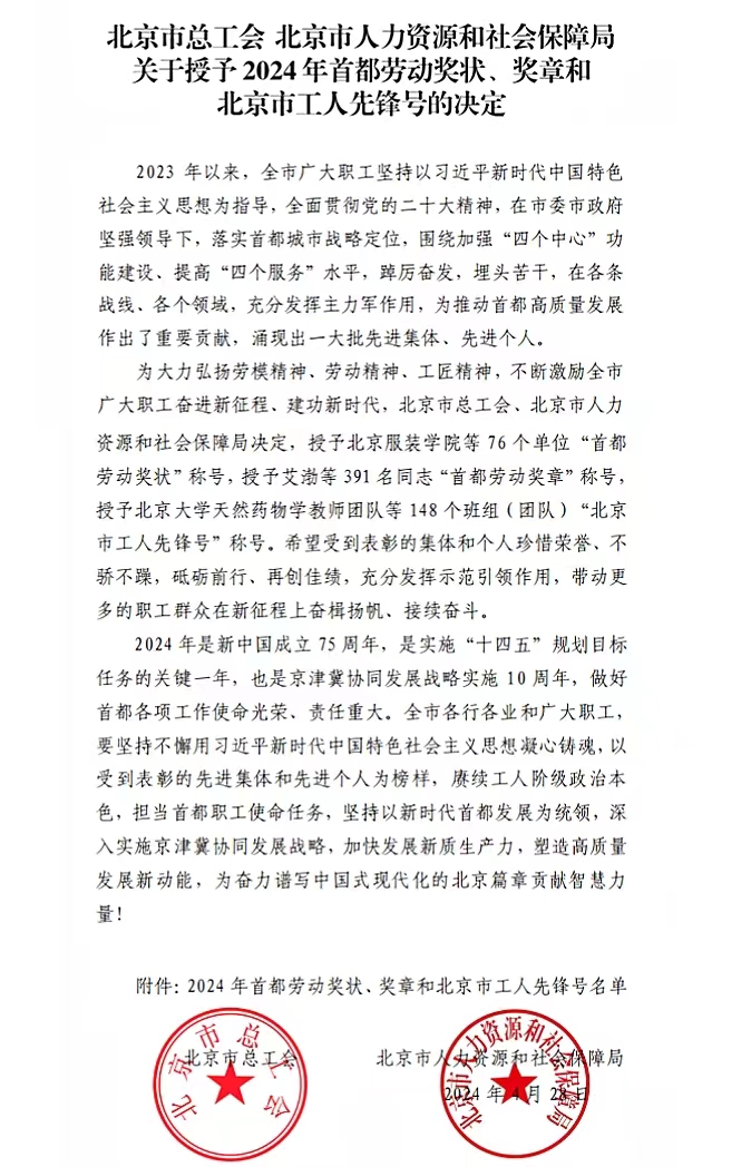 4月28日,由北京市总工会、北京市人力资源和社会保障局联合举办的2024年首都劳动奖状、奖章和北京市工人先锋号评选结果揭晓,公司生物质清洁转化与利用教师团队获评北京市“工人先锋号”。