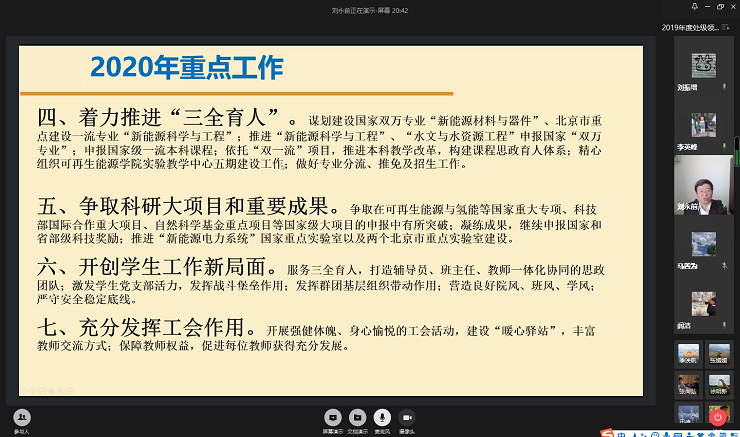 根据公司党委关于2019年度处级领导班子及处级干部考核工作的安排,3月10日下午,公司通过企业微信视频会议召开了2019年度处级领导班子、处级干部考核会,会议由公司党委书记刘永前主持,学院领导及全体教职工参加了会议。