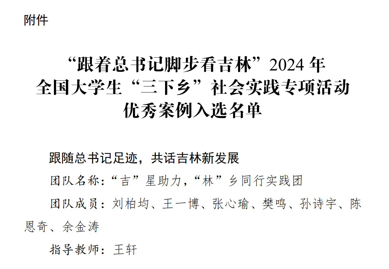 近日,共青团吉林省委、吉林省学联发布《关于入选“跟着总书记脚步看吉林”2024年全国老员工“三下乡”社会实践专项活动优秀案例的通知》。公司“吉”星助力 “林”乡同行实践团入选“跟着总书记脚步看吉林”2024年全国老员工“三下乡”社会实践专项活动优秀案例。