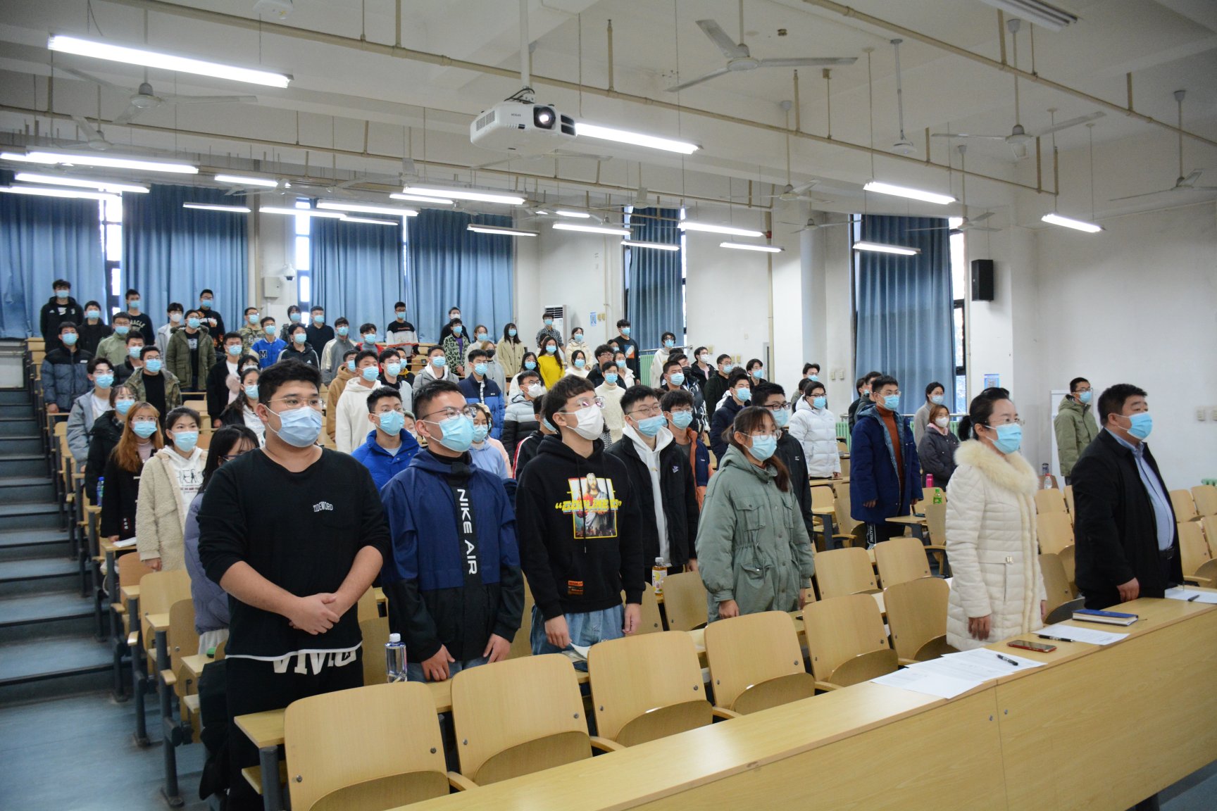 2021年11月10日中午,304永利集团第52期入党积极分子培训班开班仪式在主B101召开,新能源公司党委书记王集令、党委副书记姜良杰出席本次开班仪式。仪式伊始,全体人员起立,奏唱国歌。