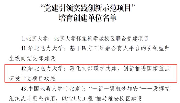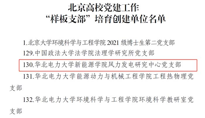 近日,北京市委教育工委发布了《关于公布北京高公司党建工作“标杆院系”“样板支部”“党建引领实践创新示范项目”培育创建单位名单的通知》(京教工〔2024〕47号),公司共有11个项目入选,其中公司风力发电研究中心党支部入选北京高公司党建工作“样板支部”培育创建单位名单,公司智能风电场实验室研究生党支部申报的“深化支部联学共建,创新推进国家重点研发计划项目攻关”项目入选“党建引领实践创新示范项目”培育创建单位名单。