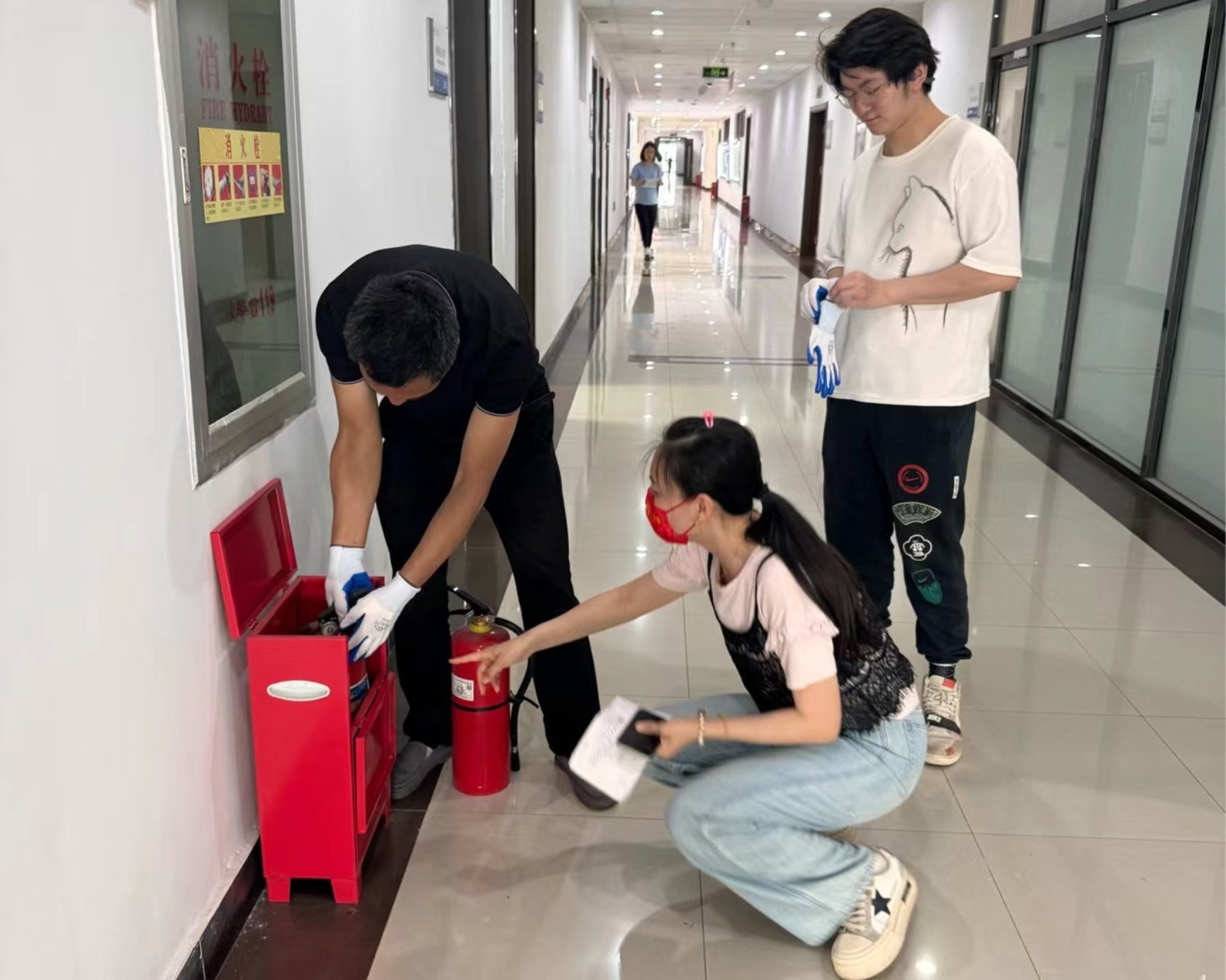 本次主要检查了主楼B座学院办公、实验区域楼道配备的消防栓、灭火器、报警设施,以及各实验室的消防设施、门窗、电源等情况,重点针对防汛、防漏、用电及危化品等方面进行了安全隐患排查。